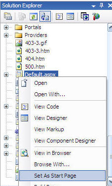 | In the SOLUTION EXPLORER right-click on the "Default.aspx" page and select SET AS START PAGE. |