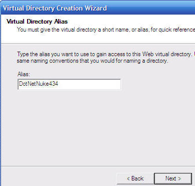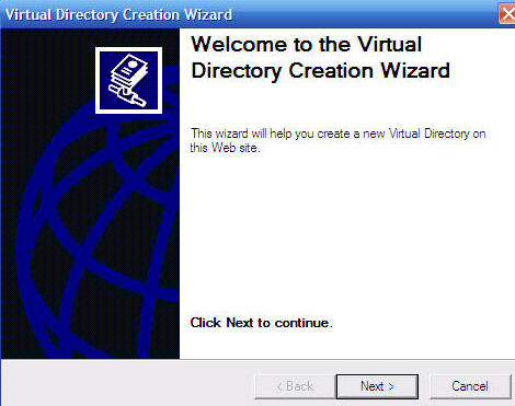 | (The following screen shots are on Windows XP Professional) In IIS configuration, create a new Virtual Directory. |