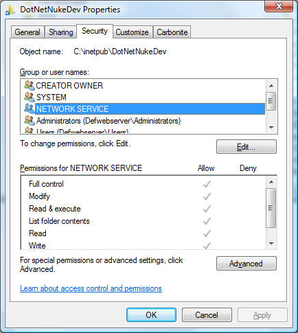| On the Security tab, click the Edit button to change the permissions. Add NETWORK SERVICE and give it Full Control. |