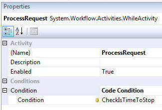 ProcessRequest will normally terminate only when the CheckIsTimeToStop variable (in the code behind) is true. Notice that CheckIsTimeToStop is set as the Condition.